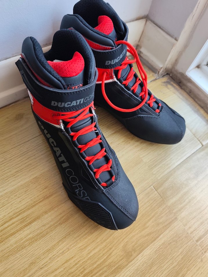 Ducati markalı, kırmızı bağcıklı ve baskılı detaylara sahip erkek biker botları, dayanıklı kauçuk malzemeden üretilmiştir. Spor ve şık kullanım için uygundur. ️su geçirmez motorda kullanıma uygun çelik korumalı