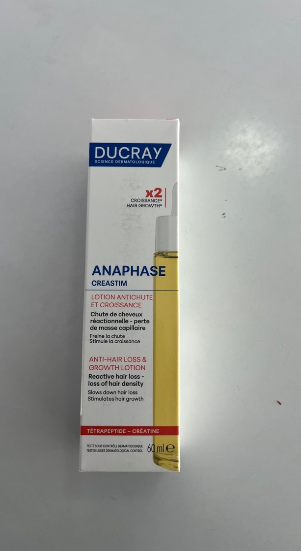 Ducray Anaphase losyon, saç dökülmesini yavaşlatır ve saç büyümesini destekler. Reaktif saç dökülmesi ve saç yoğunluğu kaybı için uygundur. Tetrapeptid ve kreatin içerir.