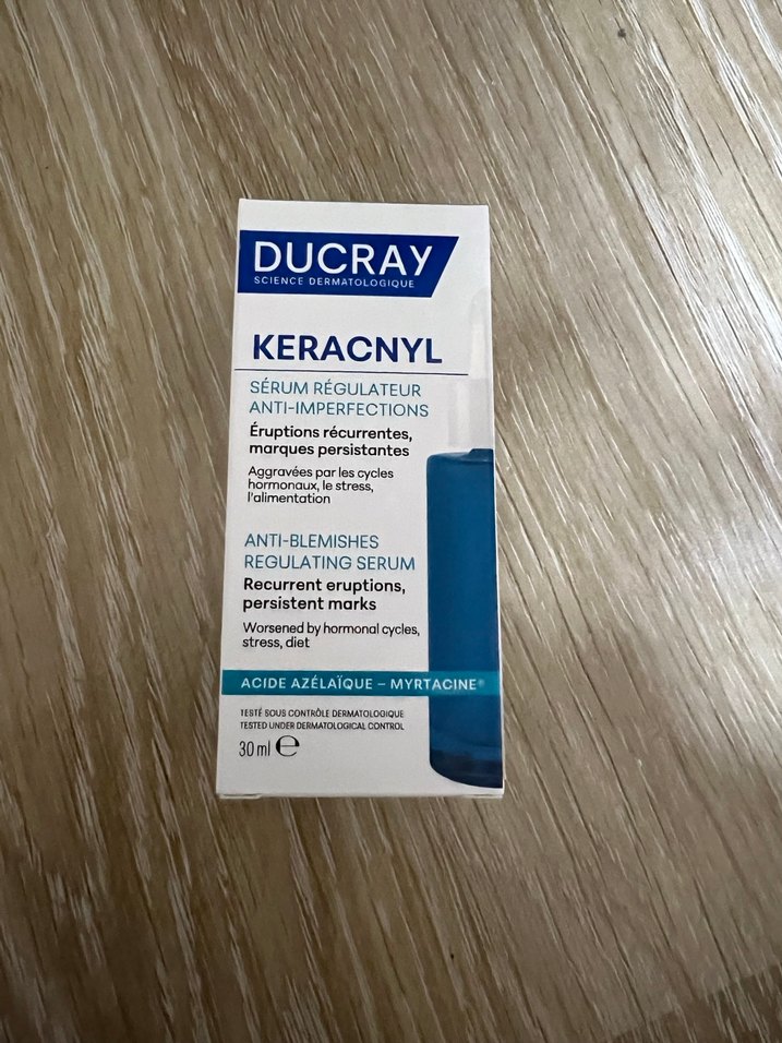 Ducray Keracnyl Anti-İmpürlük Düzenleyici Serum, hormonal döngüler, stres ve diyetle kötüleşen tekrarlayan sivilce ve kalıcı izleri azaltmak için azelaik asit ve myrtacin içerir.