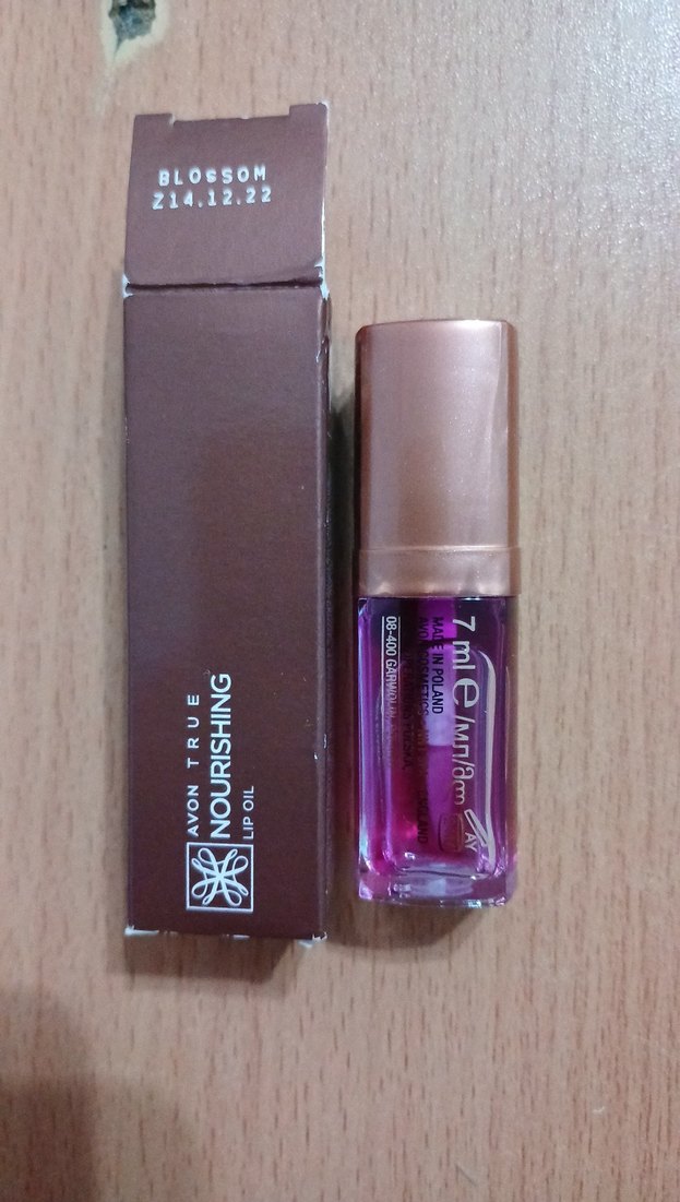 Avon True Nourishing markalı parlak mor dudak parlatıcısı, canlı ve parlak bir görünüm sunar. Üzerinde "214.12.22, BLOSSOM" yazmaktadır.