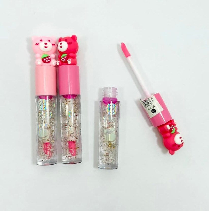 Renkli pembe dudak parlatıcısı, sevimli ayıcık kapaklı ve parlak bir görünüm sağlar.