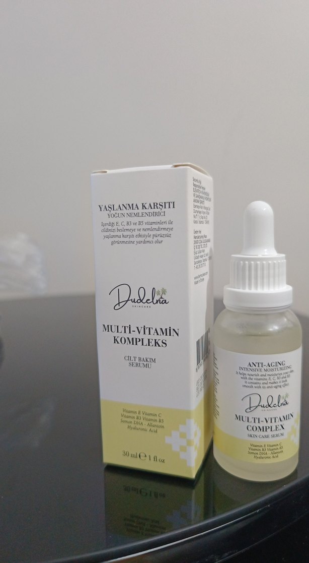 Dudelna Çoklu Vitamin Kompleksi yaşlanma karşıtı serum, yoğun nemlendirme sağlar ve C, E, B3, B5 vitaminleri ile cilt yenilenmesini destekler.