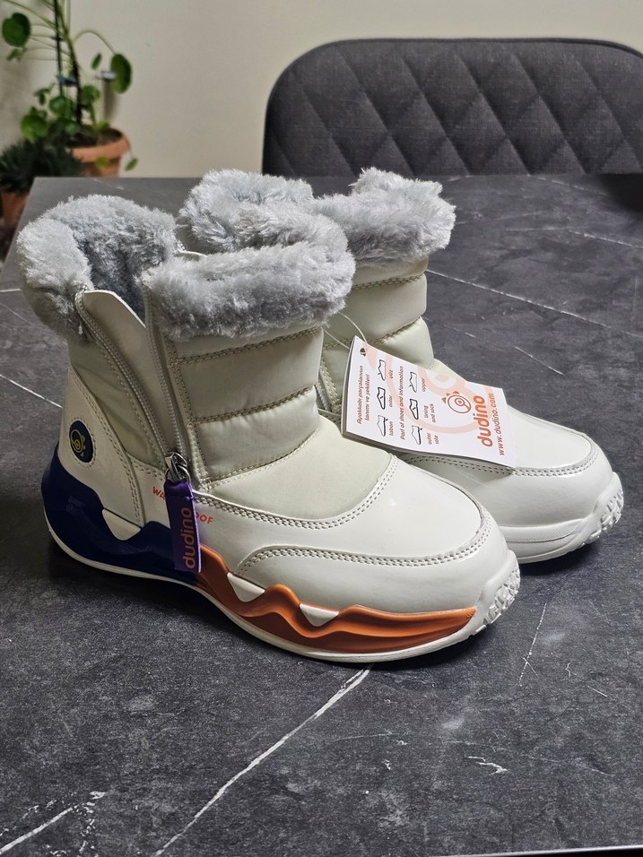 Yumuşak tüylü iç detaylı beyaz ve gri tonlarında hiç kullanılmamış çocuk bot.