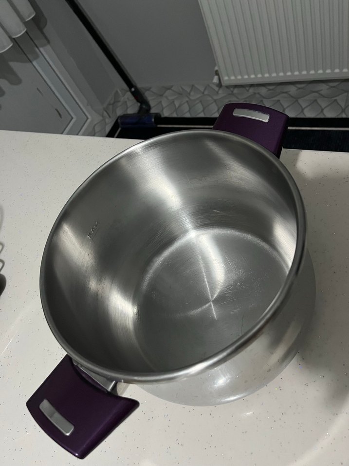 Paslanmaz çelikten, parlak yüzeyli ve mor saplı tencere, çeşitli yemekler için uygundur. Düdüklü Tencere Pazarlı payı vardır.