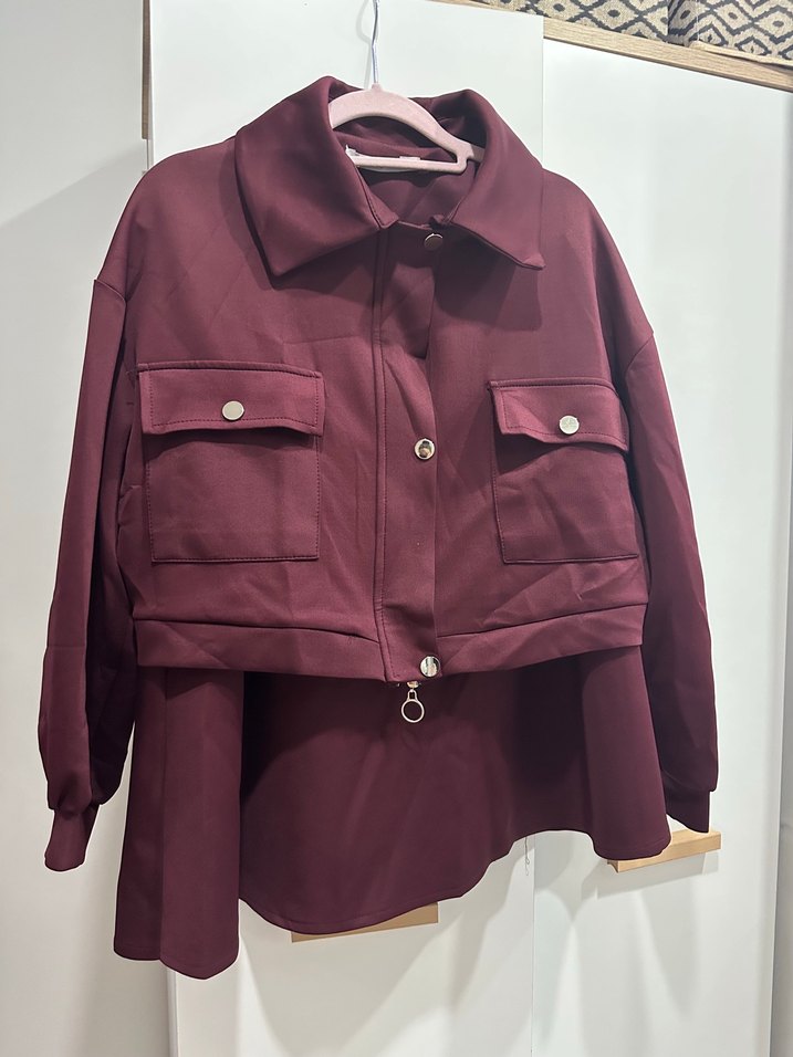 Bordo renk, düğmeli, uzun kollu, mini boy, bol kesim kadın ceket. Duendecadan alındı Birkez giyildi ince scuba kumaştır.
