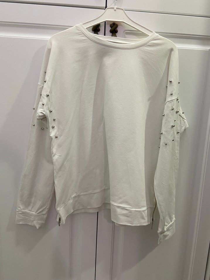 Düğme detaylı uzun kollu, beyaz pamuklu sweatshirt. Salaş kesimi ve bisiklet yakasıyla günlük rahatlık sağlar. Midi boyda ve desen sizdir. Sorunsuz