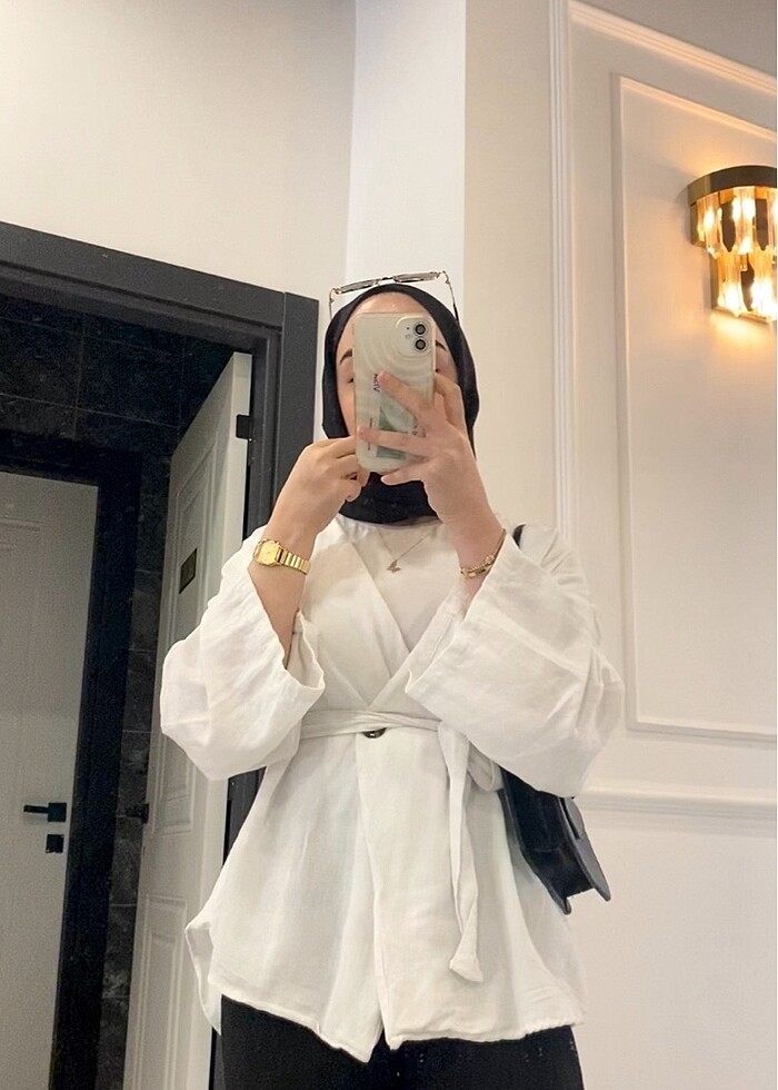 Düğme detaylı kemerli keten kimono