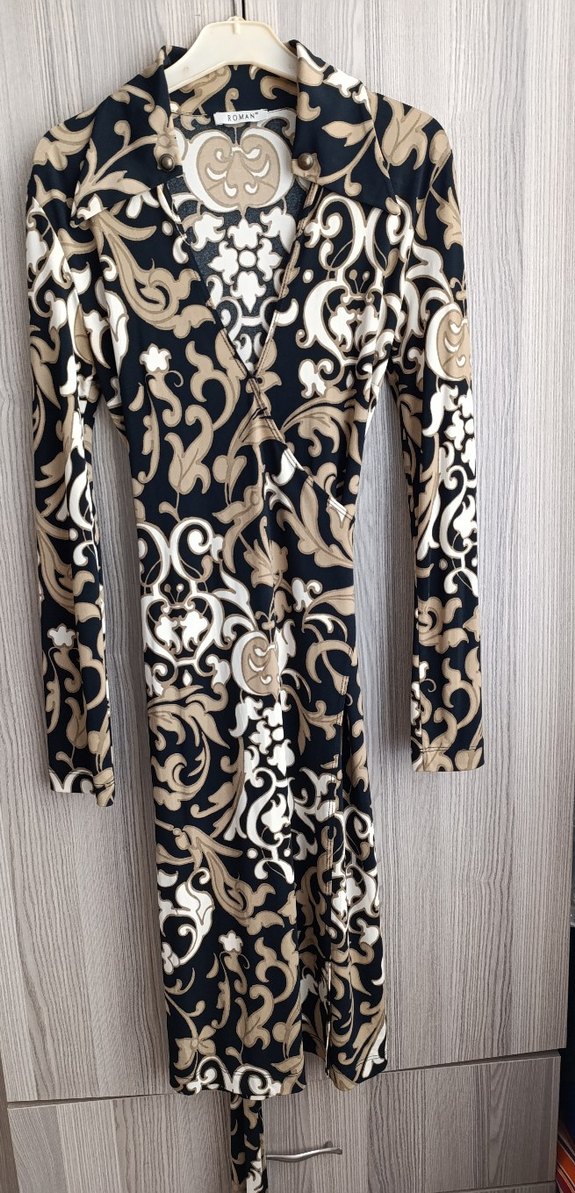 Sentetik kumaştan yapılmış, düğme detaylı, V yaka ve uzun kollu, klasik ve bohem tarzda, ofis için uygun, desenli ve dar kesim kadın uzun elbise.