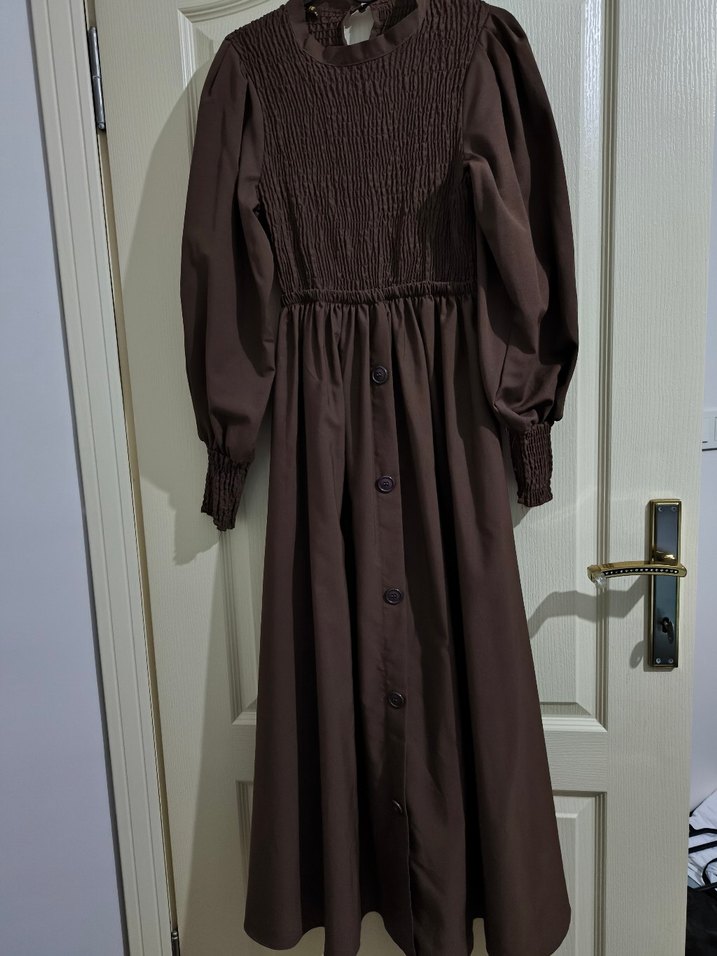 Düğmeli acı Kahve Uzun Elbise