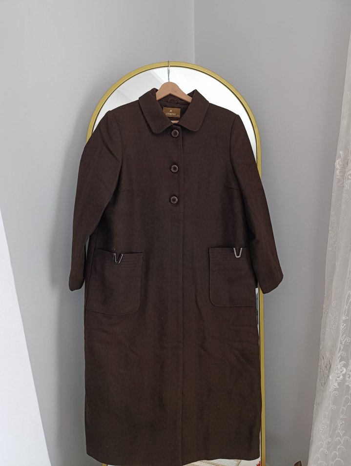Acı kahve kaşe kaban, düğmeli ve kesimli yakaya sahiptir. Uzun boy, regular fit ve modern klasik tarzıyla ofis kullanımı için uygundur. Uzun kollu ve iki ön ceplidir. 38-40 beden uyumlu