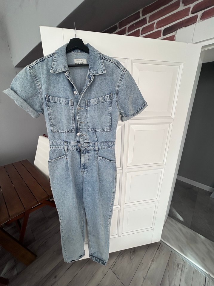 Açık mavi denim tulum, kısa kollu, düğmeli ve notched yakaya sahip. Regular fit ve midi boyda, gündelik sokak stili için uygun.