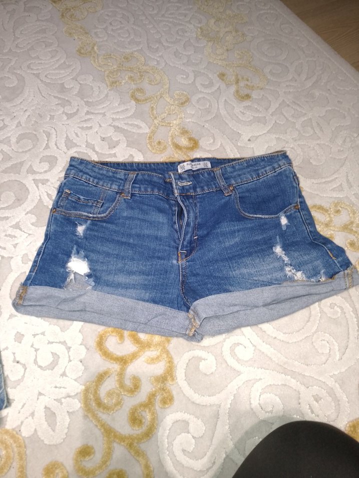 Açık mavi renkli, düğmeli ve bol kesim kadın denim mini şort. Sokak stili için uygun, hafif yıpratma detaylı ve katlamalı paçalı. Günlük kullanım için ideal. Boy 26 cm bel 38 cm.Hiç kullanılmadı.Orjinal ürün..