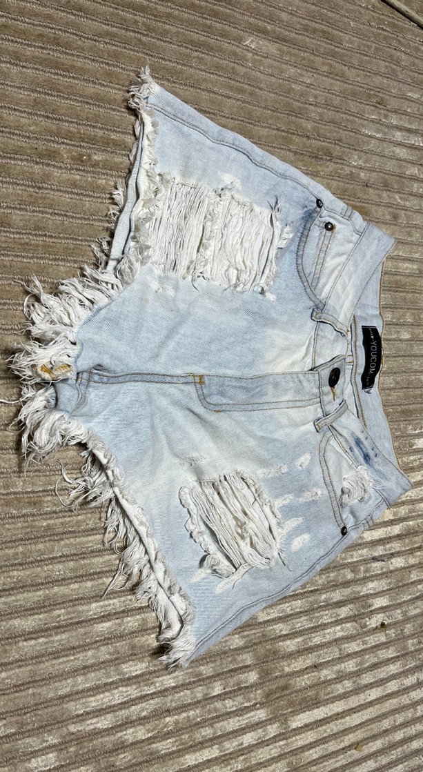 Düğmeli, açık mavi renkli, bol kesim kadın denim şort. Yırtık detayları ve kısa boyuyla gündelik sokak tarzına uygun.