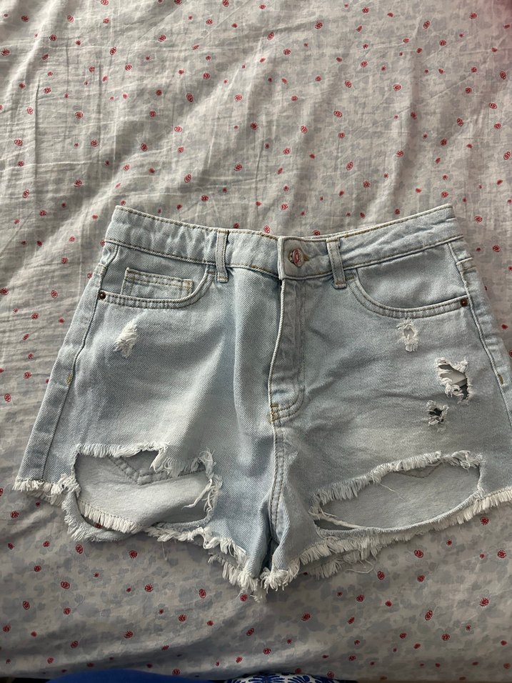 Açık mavi renkli, düğmeli ve yırtık detaylı, bol kesim kadın kot şort, günlük sokak tarzı için uygun.