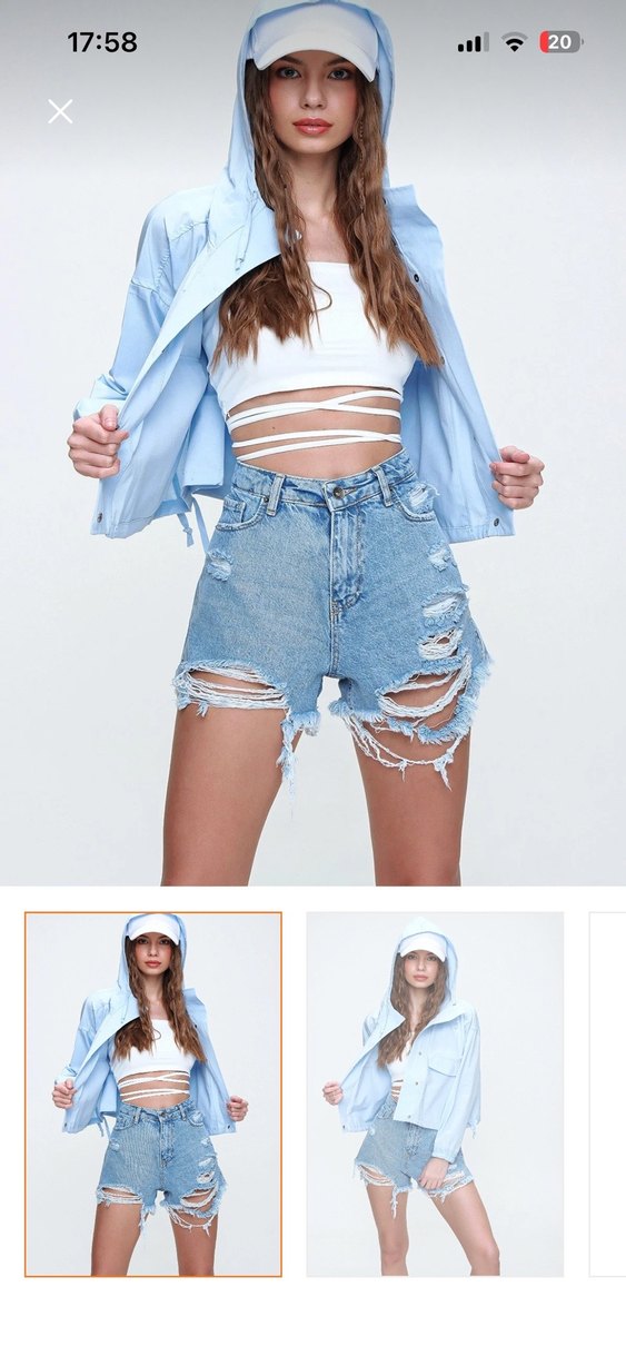 Düğmeli, açık mavi renkli, bol kesim mini kot şort. Yırtık detaylarıyla günlük sokak stiline uygun. Her gün kullanıma uygun.
