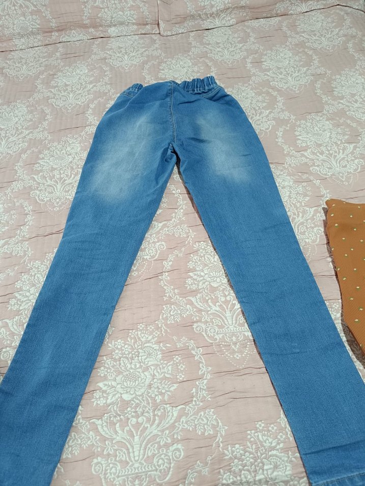 Düğmeli detaylı, açık mavi kot pantolon.