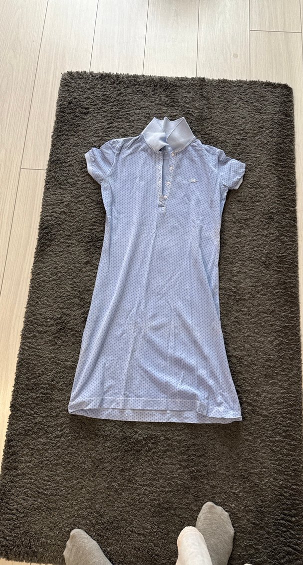 Beyaz midi uzunlukta, kısa kollu ve yakalı düğmeli elbise. Sentetik kumaştan, vücuda oturan kesimle gündelik sokak stili için uygundur.