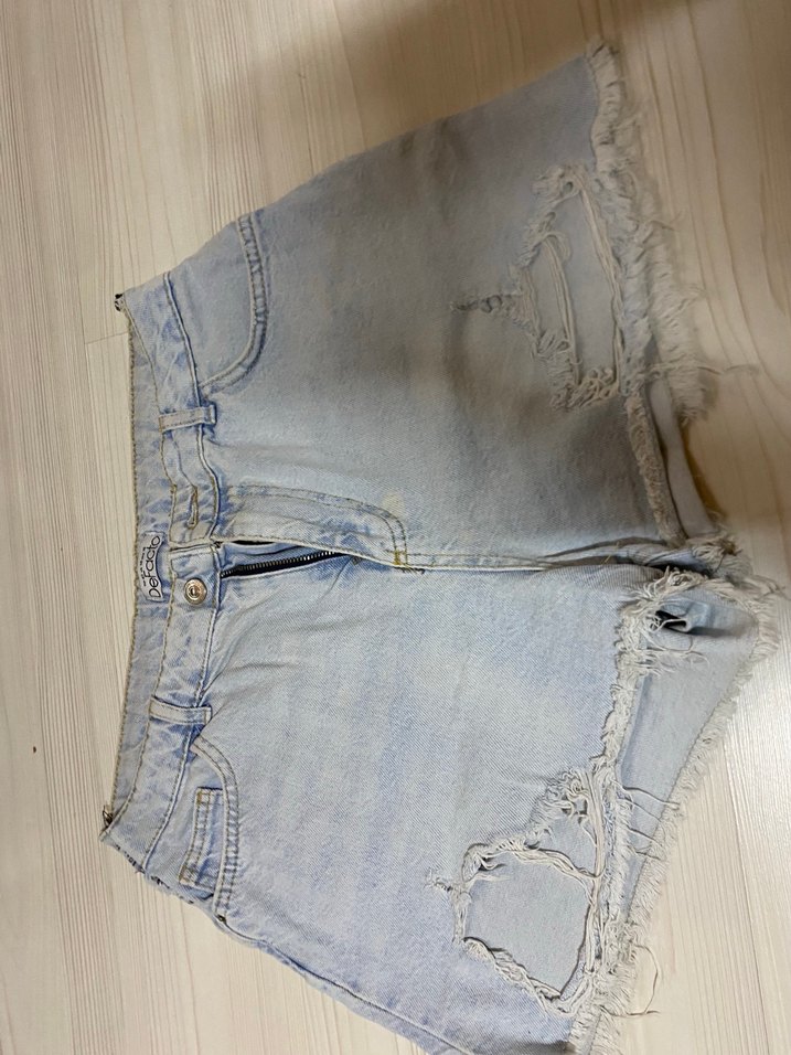Düğmeli, açık mavi renkli, rahat kesim mini denim şort, yırtık detaylarıyla günlük sokak stiline uygundur.