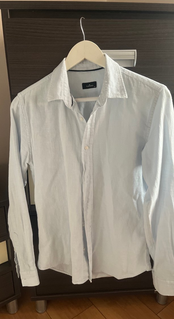 Düğmeli, yakalı ve uzun kollu erkek keten gömlek. Nefes alabilir kumaştan, regular fit kesimle, iş veya günlük sokak stili için uygundur.