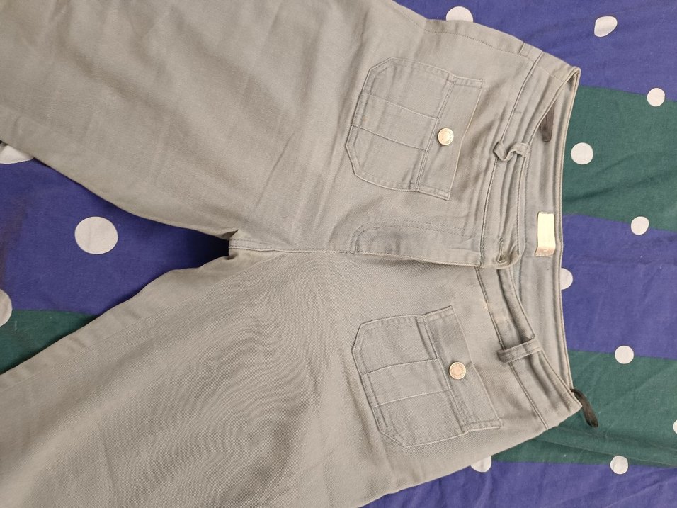 Düğmeli cepleri ve normal midi boyu ile mavi fitted kesim kadın denim pantolon. Günlük sokak stili için uygundur.