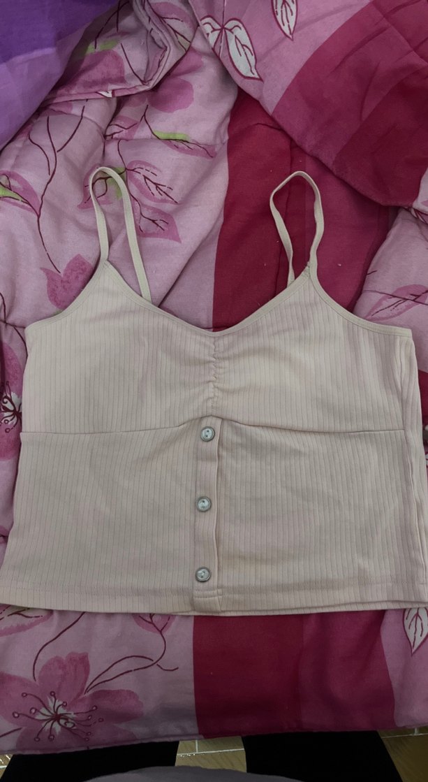 açık pembe ince askılı, düğmeli ve yumuşak sentetik kumaştan yapılmış dar kesim atlet. Günlük sokak stili için uygundur.