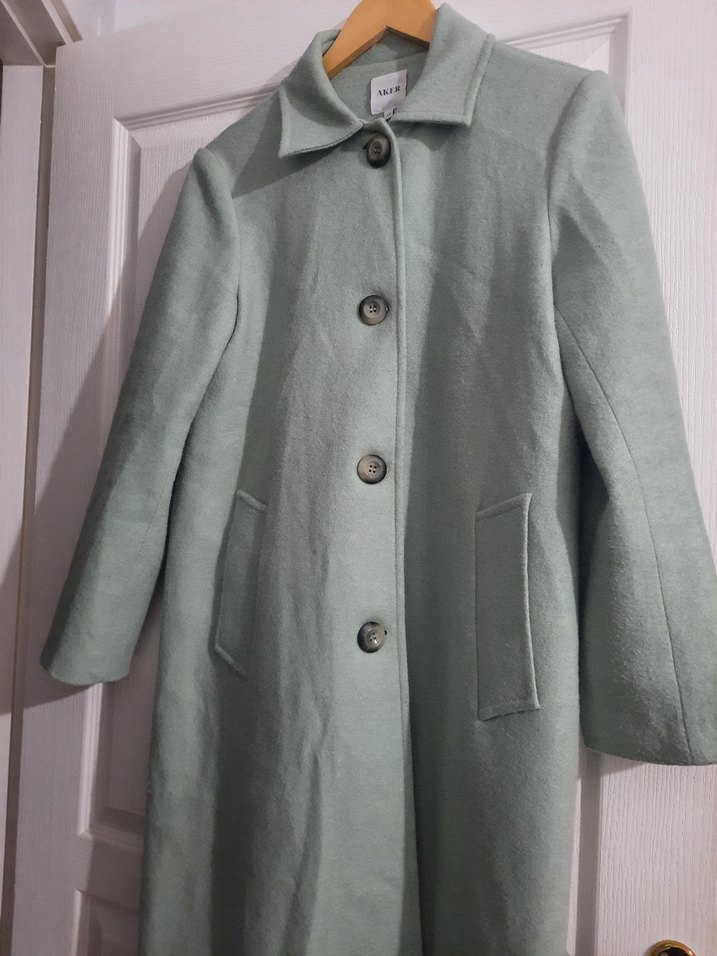 Düğmeli, uzun kollu ve iki cep detaylı açık yeşil kaban. Yumuşak dokusu ve klasik yaka tasarımı ile sade ve şık bir görünüm sunar.