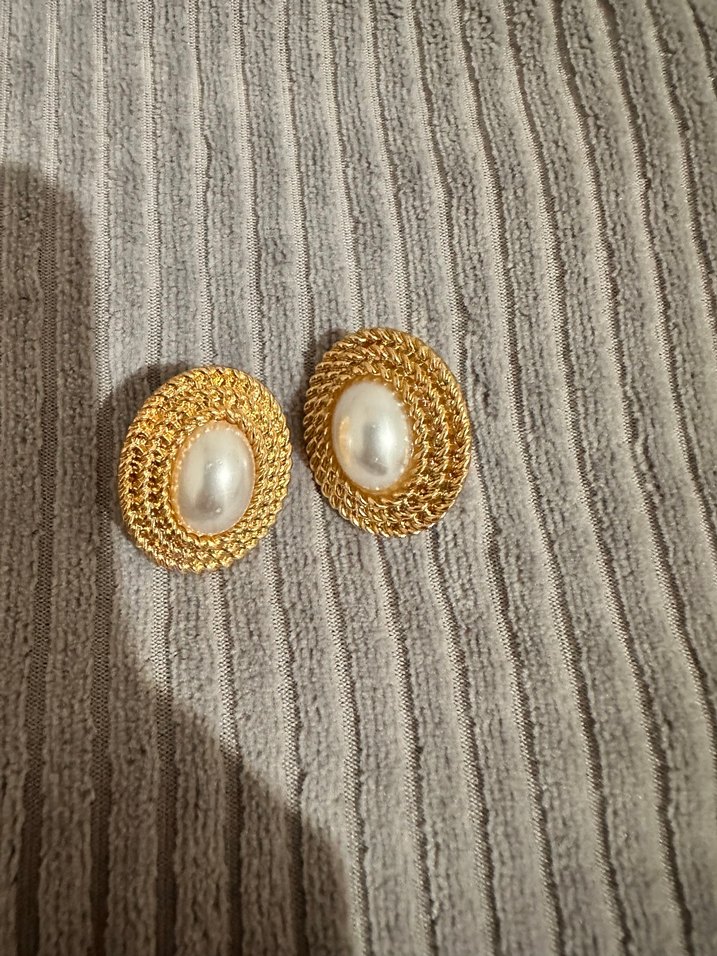 Düğmeli, parlak altın renkli ve işleme desenli, ortasında inci detaylı vintage midi küpeler. Düğünler için modern klasik tarzda.