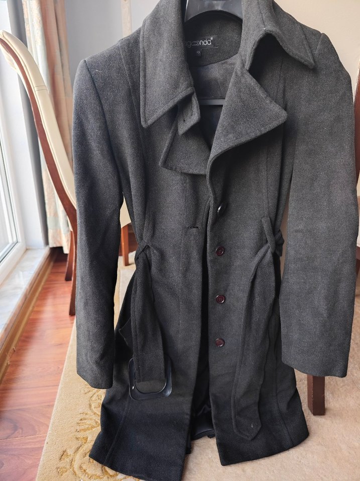 Düğmeli, geniş yakalı antrasit kaban. Yan cepleri ve kemer detayı ile vücuda oturan kesim. Sıcak tutan kumaştan üretilmiştir.