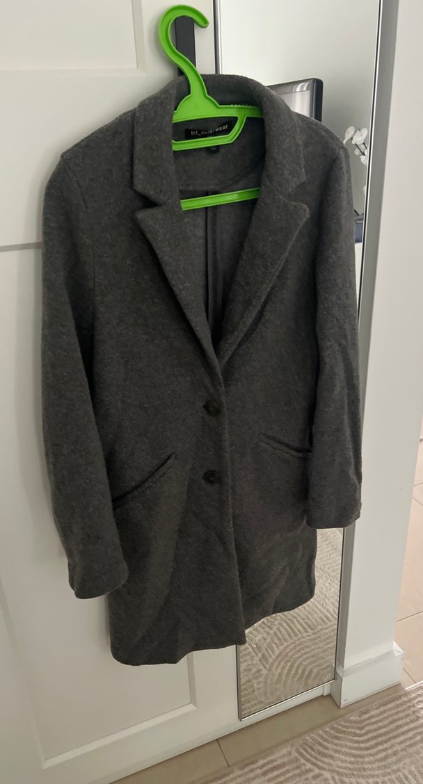 Antrasit renkli kaban, düğmeli kapama ve iki cep ile klasik yaka tasarımına sahiptir. Rahat ve şık bir modeldir.