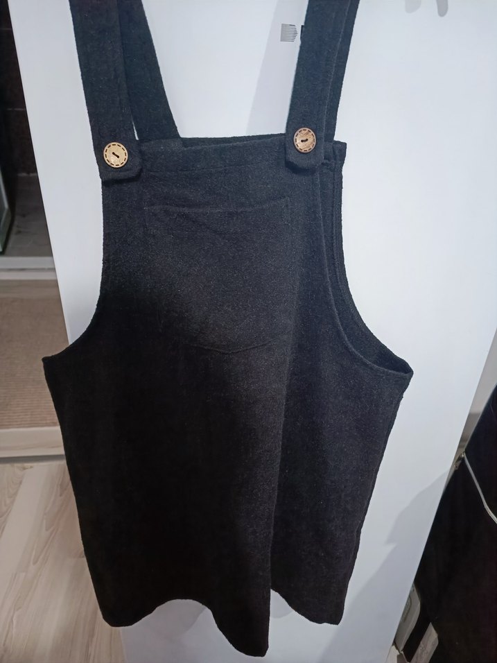 Düğmeli askılı, yumuşak ve sıcak kumaştan, sokak tarzına uygun.Max iki kez giyilmiştir.Kumaşı kaşe gibi o yüzden hafif tuylenmiş gibi gözükebilir fakat kullanım kaynaklı değildir kendinden öyledir.Gomleklerle de çok tatlı duruyor.Rengi tam siyah da değil gri de değil koyu antrasit gibi.İklim den almıştım markası DeFacto değil