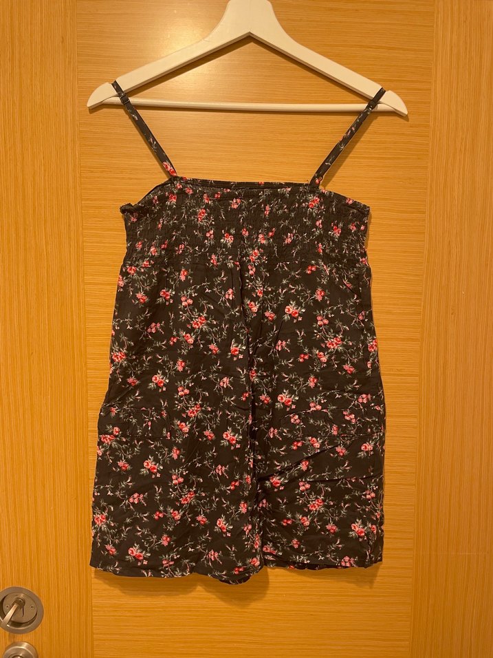 Düğmeli, askılı ve straplez yakalı hamile bluzu. Yumuşak sentetik kumaştan, koyu renkli bohem tarzda bağlama desenli, günlük kullanıma uygun.