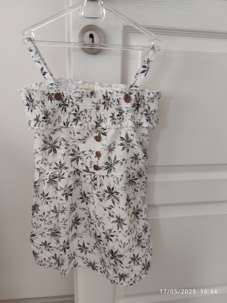 Düğmeli, askılı, keten kumaştan, bohem desenli, bol kesim beyaz bluz.
