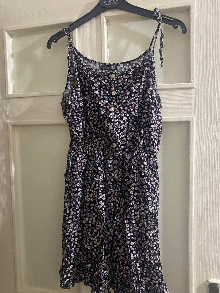 Askılı, düğmeli ve midi boy kadın elbise, bol kesim ve koyu mor batik desenlidir. Yumuşak sentetik kumaştan üretilmiştir, günlük rahat kullanım için uygundur. görselde üstte duruşu mevcuttur