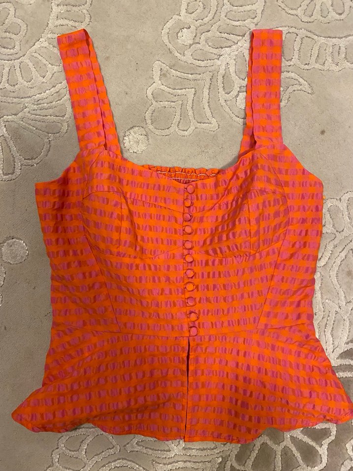 Düğmeli ön kısmı ve parlak pembe batik deseni olan, askılı, vücuda oturan midi uzunlukta tekstil kumaştan büstiyer. Bedeni L ancak 36 bedene uygun, kalibi dar