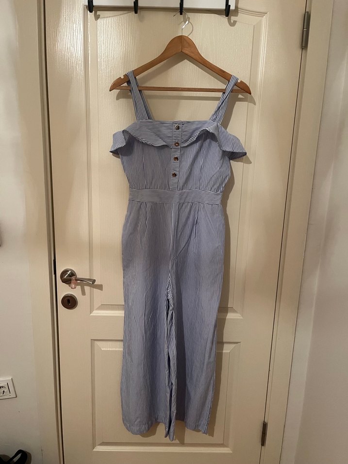 Uzun, bol kesim kadın tulumu, askılı straplez yaka ve düğme detaylarına sahip, yumuşak keten kumaştan yapılmıştır. Mavi renkte, günlük rahat sokak stili için uygundur.