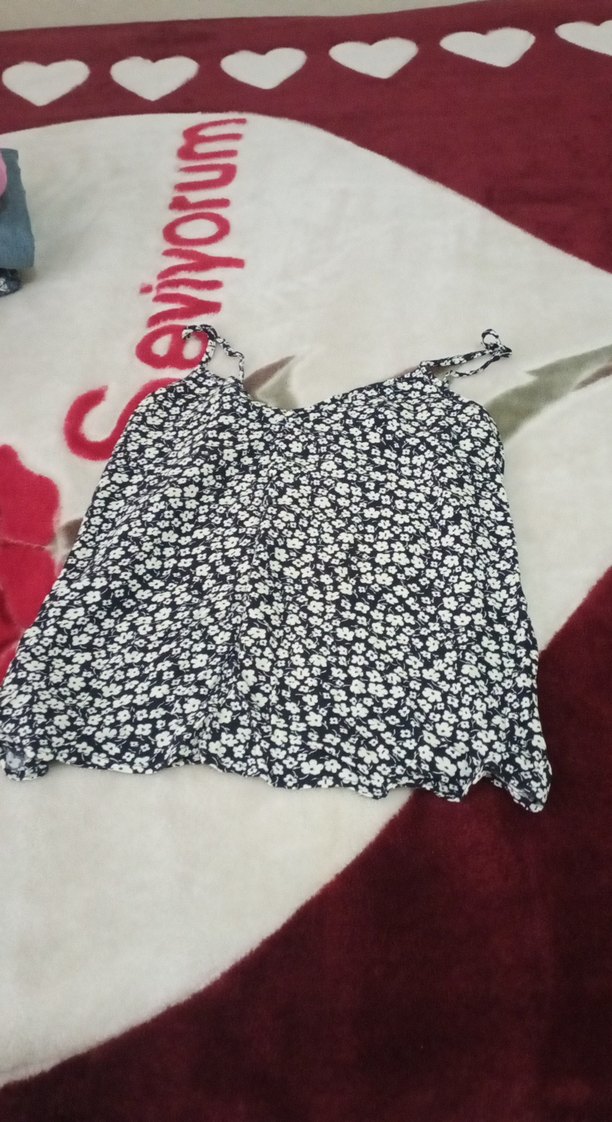 Düğmeli ön kısmı olan askısız mini bluz, sentetik kumaştan, bol kesim ve koyu renkli batik desenlidir. Rahat sokak stili için uygundur.