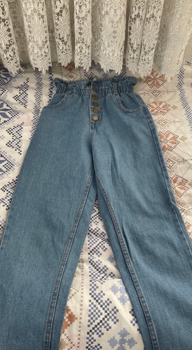 Pastel mavi denim kumaştan, düğmeli ve beli büzgülü, bol kesim rahat kot pantolon. Günlük sokak stiline uygun.