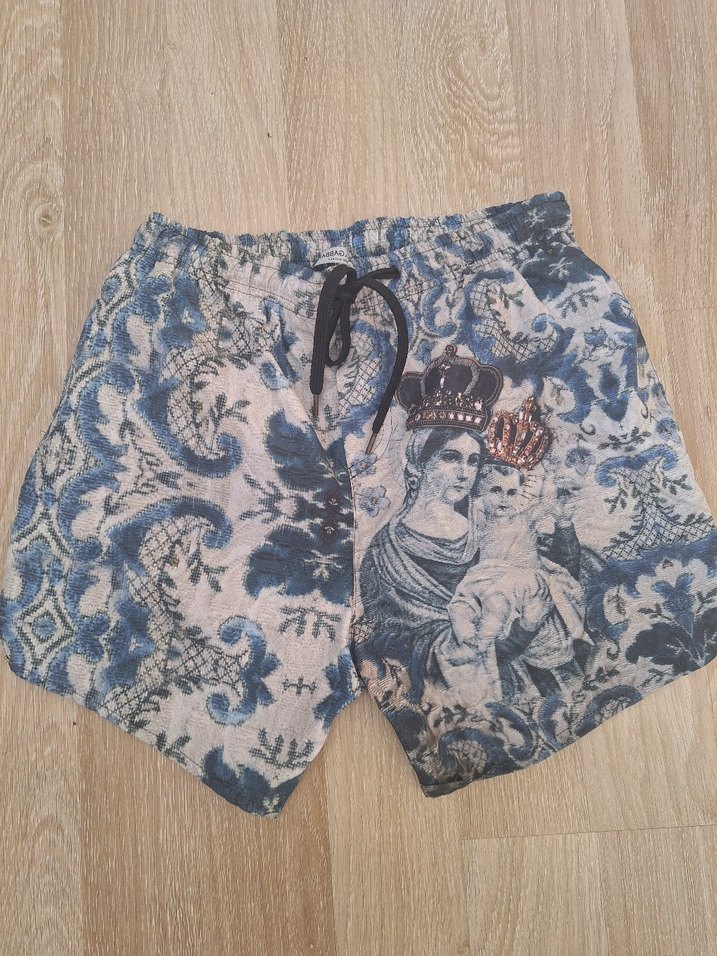 Mavi ve gri batik desenli, düğmeli ve bağcıklı, bol kesim deniz şortu erkek