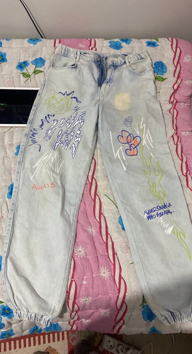 Düğmeli, bol kesim denim kot pantolon. Pastel tie-dye ve renkli sokak stili baskılarıyla midi boy, günlük kullanıma uygun. Üzerinde "AWAY" yazısı bulunur.