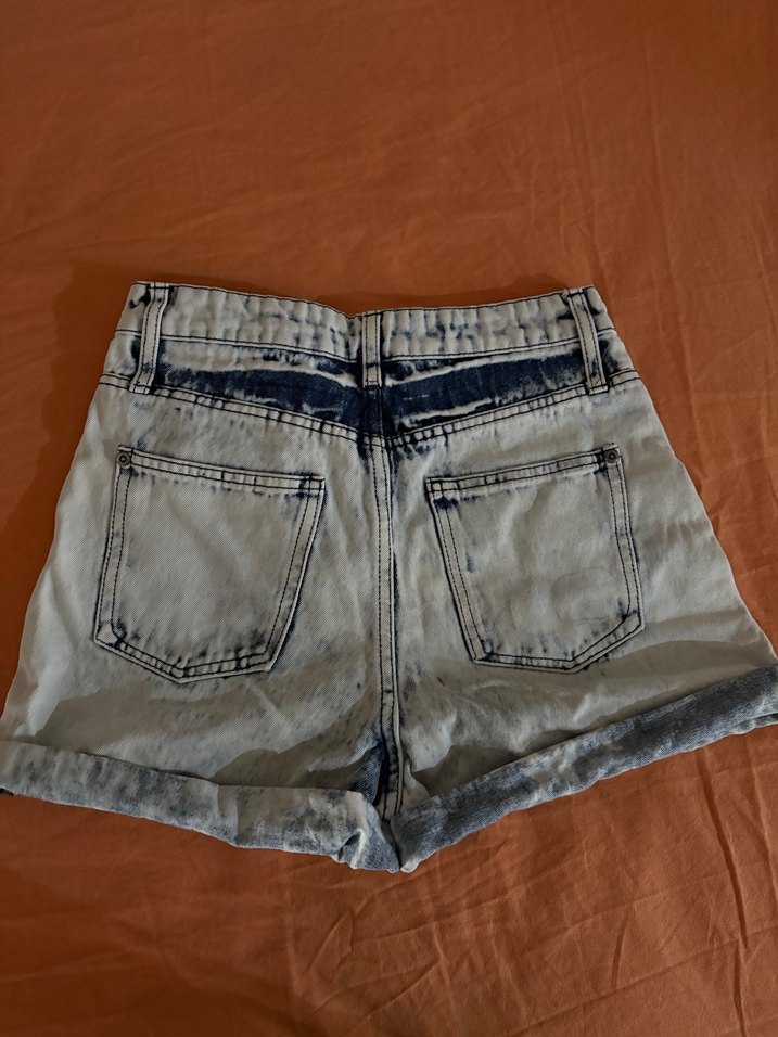 Düğmeli, bağlama desenli, bol kesim kadın kot şort. Kısa boylu, mavi-gri tonlarında, rahat sokak stili için uygundur.