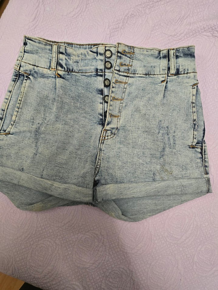 Düğmeli ön kısmı ve pastel mavi bağlama desenli kısa, dar kesim kot şort, günlük sokak stiline uygun.