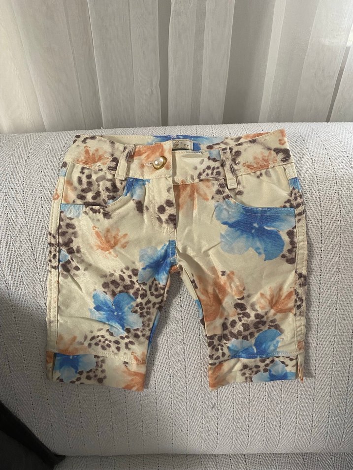 Düğmeli kapamalı, bej tonlarında bağlamalı desenli, sentetik kumaştan yapılmış, dış mekan sokak stili için uygun dar kesim şort. Marka temsilidir