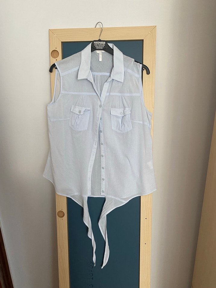 Pamuklu, kolsuz açık mavi gömlek, halter yaka ve düğmeli ön cep detaylarına sahip. Salaş kesim ve bağlamalı etek ucu ile günlük kullanıma uygundur. L beden rahat giyebilir