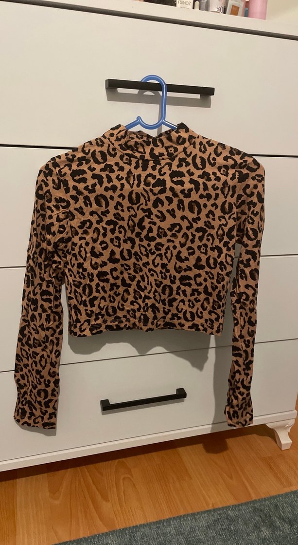 Düğmeli, balıkçı yaka ve uzun kollu, yumuşak süet kumaştan yapılmış, koyu kahverengi yılan desenli dar kesim kadın bluz. Günlük rahat sokak stili için uygundur.