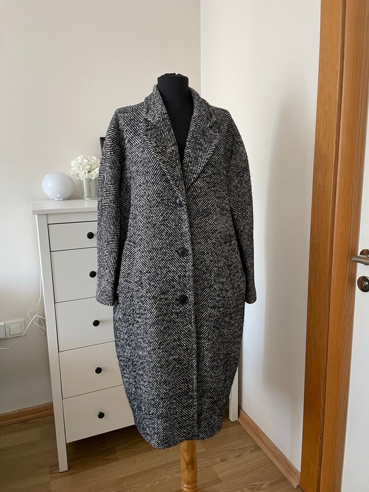Düğmeli ve klasik yakalı, dokulu kumaştan yapılmış balıksırtı uzun kaban, soğuk günler için sıcaklık ve şıklık sunar. ❄️ Kol altından eni 62 cm boy 107 cm.