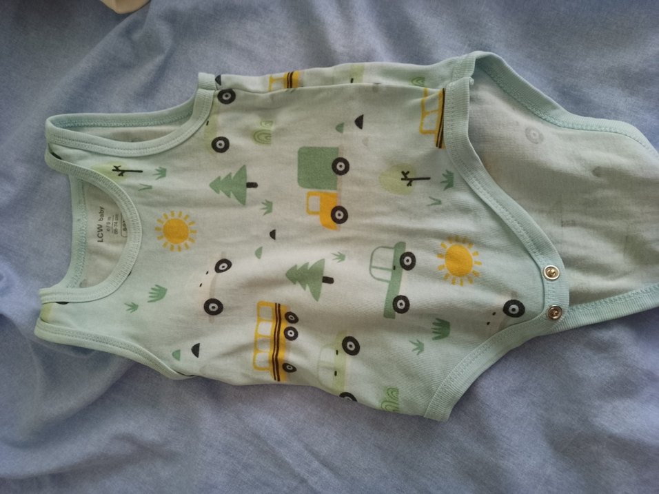 Kolsuz, yuvarlak yakalı ve düğmeli bebek atlet body. Yumuşak kumaştan, pastel yeşil renkte, baskılı araba ve ağaç desenleriyle streetwear tarzında.