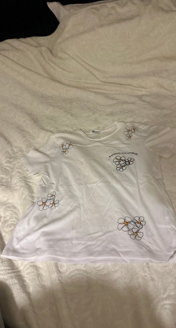 Pamuklu, kısa kollu, yuvarlak yakalı, bol kesim beyaz tişört. Pastel renkli çiçek baskıları ve düğme detayları içerir, gündelik sokak stili için uygundur. Yüzde yüz pamuklu çok güzel bir tşort güle güle kullanın