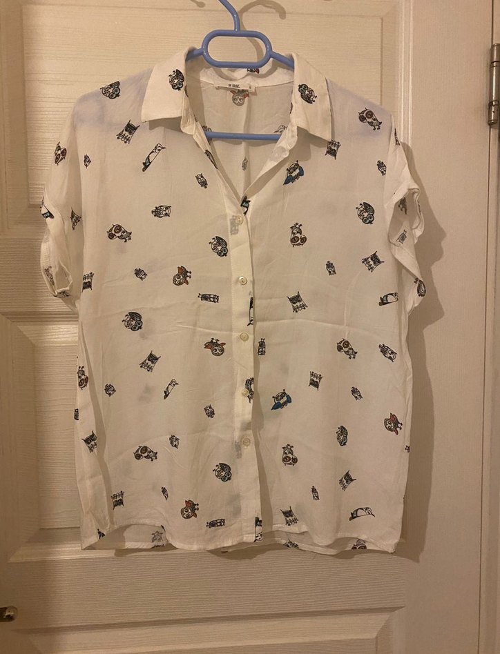 Pamuk kumaştan, beyaz renkli, kısa kollu, yakalı, düğmeli, rahat kesim ve baskılı desenli gömlek.