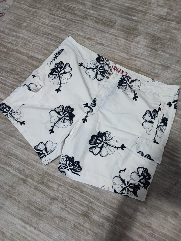 Pamuk kumaştan, düğmeli, bol kesim beyaz tabanlı ve gri çiçek baskılı erkek mini mayo şort, günlük kullanım için uygundur.