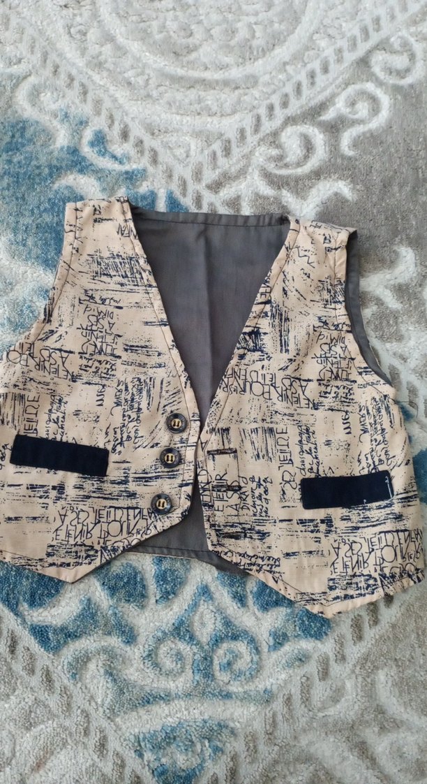 Düğmeli, baskılı sentetik kumaştan erkek çocuk yeleği. Kolsuz, dar kesim ve çentikli yaka ile rahat ve şık görünüme sahip.